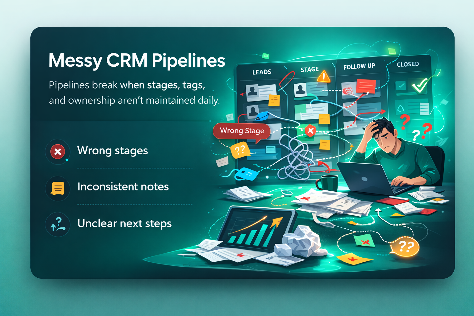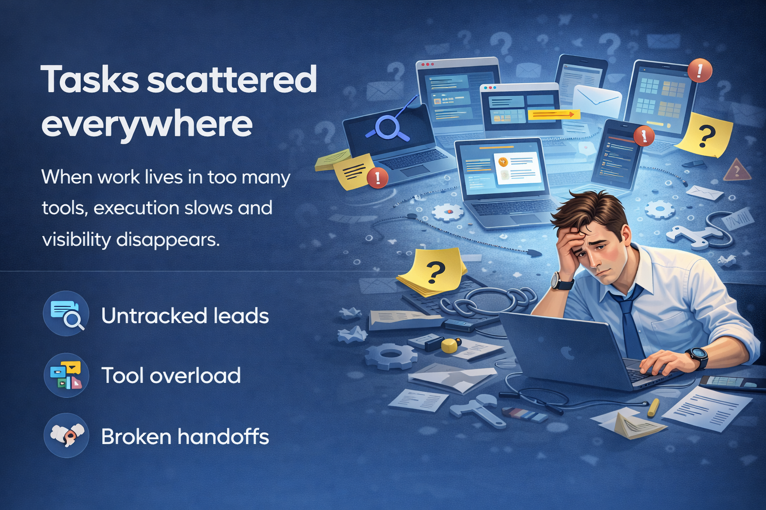 Missed follow-ups. Messy CRM pipelines. Untracked leads. Tasks scattered across platforms.